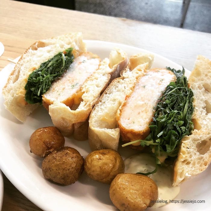 통새우 패티, 사워 도우, 루꼴라, 스위트 칠리 마요, 알감자