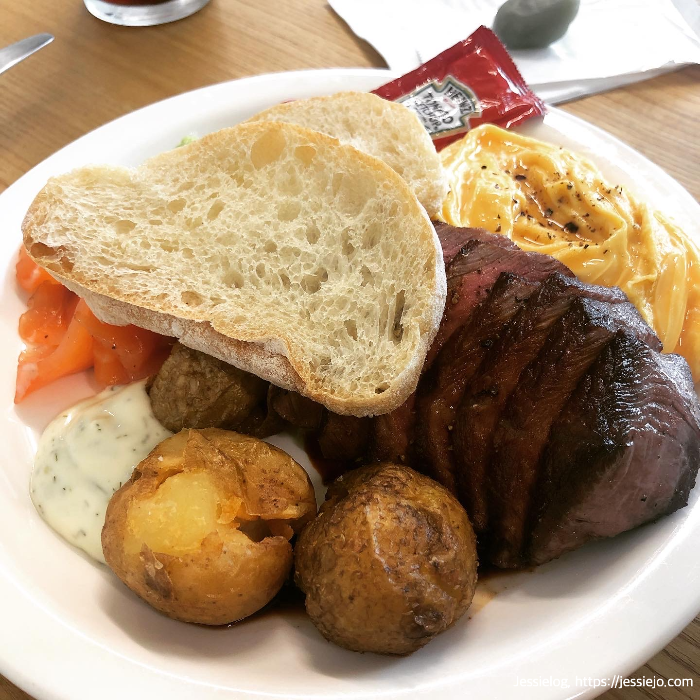 치마살 스테이크, 연어, 유정란 스크램블, 방울토마토, 알감자, 과카몰리, 치아바타, 마요 소스